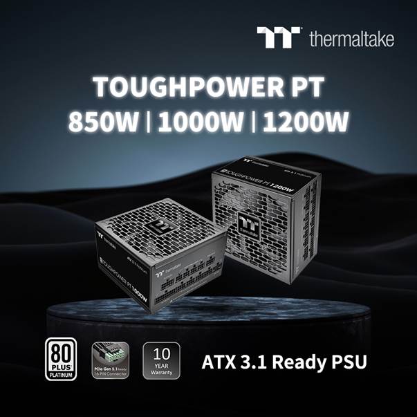 Taipei, Taiwan-October 23rd, 2025-Thermaltake, a leading PC DIY brand for premium hardware solutions, proudly announces the Toughpower PT Platinum Series, available in 850W, 1000W, and 1200W models. Engineered for enthusiasts, creators, and professionals, the PT Platinum Series delivers Intel ATX 3.1 compliance, native PCIe Gen 5.1 support, and 80 PLUS® Platinum certification, ensuring rock-solid performance, modern compatibility, and exceptional efficiency.
