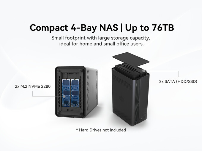 This NAS features four drive bays, giving users the flexibility to expand storage over time. It is suitable for storing photos, videos, work files, and backups in one place. The compact design also makes it easy to place on a desk without taking much space.