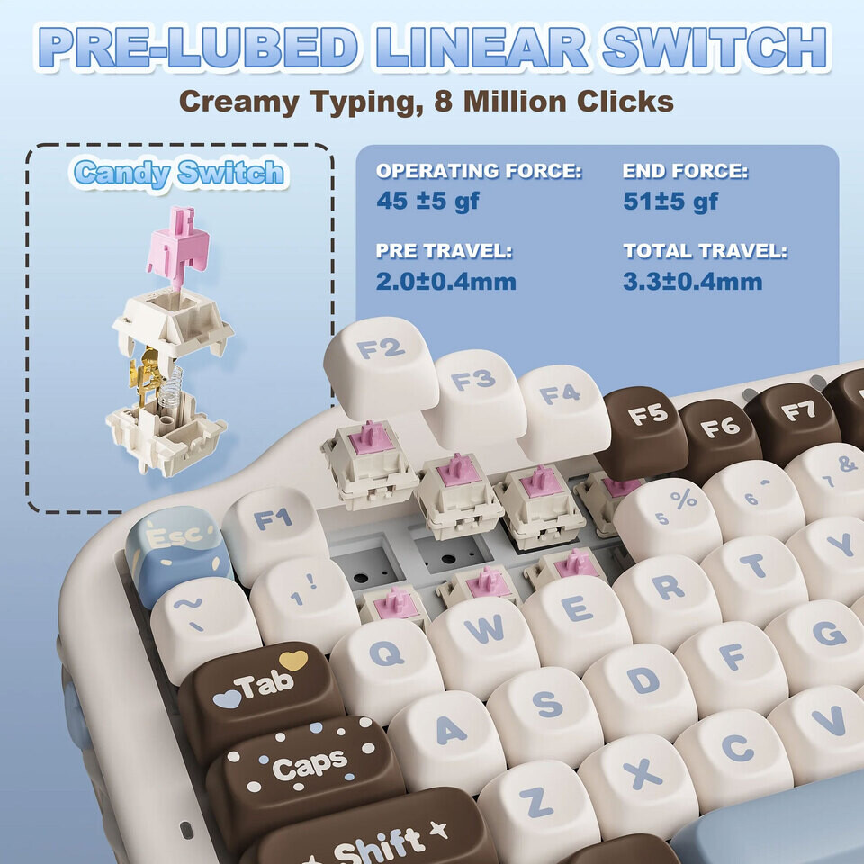 There are different switch options available as well. The Candy Linear switch offers a balanced and smooth typing feel, while the Milk V2 Linear switch is lighter and improves RGB lighting with a built in diffuser.